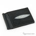 Необычный зажим из 100% кожи ската. Стенки плотные. Застежка отсутствует. Внутри 6 отделения для визиток или кредитных карт и стальной зажим для купюр.