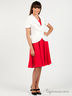 Детали: воротник отложной с лацканами, короткие рукава фонарики с небольшой манжетой, широкий отрезной пояс, застежка на одну декоративную пуговицу, имитация кармашков с небольшой сборкой по ткани.