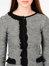 Детали: округлый вырез горловины, застежка на пуговицы, длинный прямой рукав, полочка декорирована оборкой