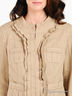 Детали: небольшой ворот-стойка; рукав 7/8 с манжетами; четыре кармана; застегивается на металлические крючки; декорирован оригинальными оборками