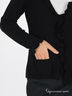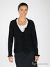 Трикотажный жакет прямого кроя. V -образный вырез. Трикотажные рукава. Края изделия обработаны рюшей. 2 накладных кармана. Жакет застегивается на пуговицы.