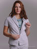 Актуальный жакет полуприлегающего силуэта без подкладки из ткани в мелкую полоску. Застежка на декоративную молнию. Модный прием: молния не втачивается, а настрачивается сверху. Карманы под клапанами.