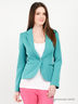 Стильный жакет из тонкой, плотной ткани. Отложной ворот с лацканами. Застежка на пуговицу. Плечи дополнены тонкими мягкими подплечниками. Длинные рукава. На полочках два декоративных прорезных кармана.