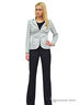 Жакет на подкладке с фигурной центральной застежкой на три глазковые петли и пуговицы (правый борт имеет 2 петли пуговицы, левый борт — одну). Жакет с двухшовными втачными рукавами со сборкой по окату, с втачным пиджачным воротником, лацканы и низ бортов с закругленными концами. Спинка со средним швом и двумя рельефами. Полочки с фигурными бочками, по шву притачивания бочка заложены и застрочены по три защипа. На каждой бочке по одной декоративной пуговице.