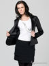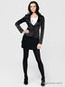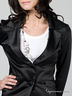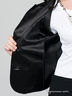 Классический приталенный силуэт. Длинный прямой рукав. Глубокий округлый вырез горловины, воротник с лацканами. Фронтальная однобортная застежка на две пуговицы, обтянутые атласной тканью. Спереди имитация карманов-клапанов. Без подклада.