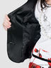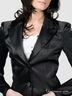 Классический приталенный силуэт. Длинный прямой рукав. Глубокий V-образный вырез горловины, воротник с лацканами. Фронтальная однобортная застежка на две пуговицы, обтянутые атласной тканью. Без карманов. Формованные плечи с декоративными вставками из основной ткани с прострочкой. Тонкий шелковистый подклад.