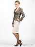 Деловой жакет из испанской тонкой шерсти в сочетании двух тканей. Застежка на трех пуговицах, рукав длинный, отложной ворот. Силуэт прилегающий.