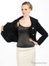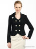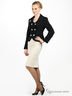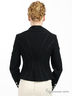 Жакет двубортный, приталенный. Рельефы украшены ручным стежком. Воротник шале-образный с отлетным лацканом. Рукав длинный, застежка на пуговицах, отлетная подкладка.