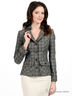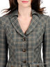 Приталенный жакет в клетку на пуговицах с отложным воротом и длинным рукавом.