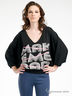 Футболка кроя летучая мышь из плотного хлопка. Рукава на резинках. Низ изделия посажен на трикотажную резинку. На полочке аппликация.