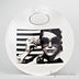 Оригинальная небольшая сумка из искусственной кожи, стилизованная под грампластинку. На передней стенке принт. Прорезные овальные ручки. Декоративная прострочка.