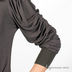 Основная часть платья и рукава выполнены из тонкой, гладкой и шелковистой трикотажной ткани. Крой платья слегка приталенный, с напуском по линии нижнего шва. Рукава длиной 3/4 присборены по окату, а так же имеют продольную декоративную сборку по длине в виде мягких складок.