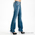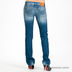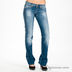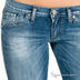 Модель прямого кроя застегивается на пуговицу и молнию. К поясу пришиты петли для ремня. Три передних кармана, два задних кармана. Декоративная вышивка на задних карманах.