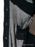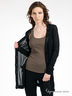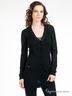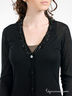 Длинный джемпер прямого кроя из слегка прозрачного трикотажа. Застегивается на пуговицы. Два передних кармана. Низ изделия посажен на трикотажную резинку. Горловина и карманы оформлены стразами и паетками.