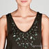 Темный топ с декоративными стразами на полочке. Покрой полуприлегающий. Низ топа посажен на широкую манжету.