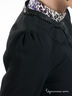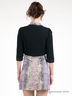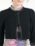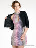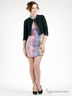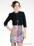 Короткий жакет прямого кроя. Круглый вырез горловины. Застегивается на крючки. Рукав три четверти. Манжеты застегиваются на пуговицы. Горловина, края полочки и манжеты обработаны кожзаменителем и украшены декоративной цепочкой.