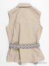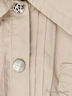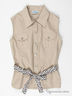 Детали: отложной воротник, застежка на пуговицы, два накладных кармана с клапанами на кнопках, в шлевки продет хлопковый поясок, декоративные рельефы.