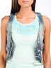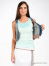 Короткий джинсовый жилет. Застегивается на пуговицы. Два накладных кармана с клапанами на пуговицах. Декорирован вставками с цветным принтом.