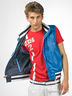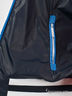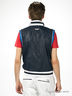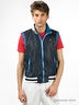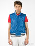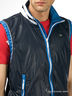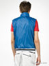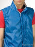Жилет мужской двустронний. Выполнен из плащевой ткани. Застегивается на молнию. Низ и ворот изделия оформлен широкой трикотажной резинкой контрастного цвета. В проймах рукавов расположены шнурки в кулиске, позволяющие регулировать ширину проймы. Внешняя сторона: светло-синий цвет, один горизонтальный карман на молнии. Внутренняя сторона: темно-синий цвет, два горизонтальных кармана на молнии.