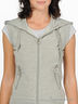 Жилет из спортивного трикотажа. Капюшон со шнурком. Два кармана на молнии. Проймы и низ изделия посажены на широкую трикотажную резинку в рубчик. Застежка-молния.