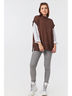 Особенности: Вязаный жилет свободного силуэта из полушерстяной пряжи с широкой двойной обточкой по пройме, переходящей в боковой разрез.
