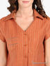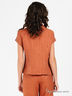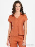Детали: V-образный вырез горловины, отложной ворот-стойка, короткий рукав, застежка на пуговицы, вытачки, один нагрудный кармашек