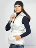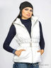 Стильный жилет из тонкого, гладкого стеганного материала. Модель дополнена капюшоном. Застежка на молнию. На полочках два прорезных кармана на молнии. Талия подчеркивается поясом.