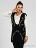 Теплый вязаный жилет оригинального дизайнерского кроя согреет Вас в холодные вечера. Крупной вязки. V-образный вырез горловины дополнен капюшоном. Низ изделия на высокой резинке. Жилет дополнен оригинальной вышивкой.