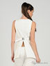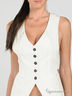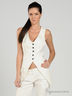 Приталенный жилет - фрак. Глубокое декольте. Широкие проймы. Застегивается спереди на пуговицы. Два прорезных кармана. На спинке хлястик. Большой разрез сзади. Ассиметричные фалды. Шелковистая полосатая подкладка.