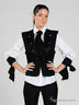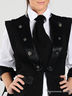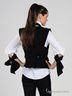 Жилет оригинального дизайна из плотного материала с шелковистой подкладкой. Круглая горловина. Широкие проймы. Лацканы на пуговицах из лоснящегося материала в рубчик. Имитация карманов. На спинке два хлястика на пуговицах.