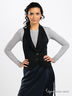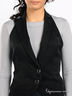 Стильный жилет оригинального кроя станет прекрасным дополнением к офисному стилю. Застегивается на кнопки и завязывается на ленты на спине. Отложной воротник-петля. На левой полочке кармашек. Тонкая шелковистая подкладка. Округлый крой низа изделия.