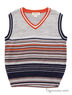 Теплый вязанный жилет для мальчика свободного кроя, выполненный из мягкого трикотажа в полоску. Горловина, пройма и низ изделия - вязанная трикотажная резинка.