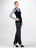 Прекрасный женский жилет приталенного силуэта, фактурной вязки черного цвета, на широких бретелях. Спереди два удобных накладных кармана.