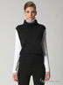 В стильном жилете оригинального кроя Вы будете чувствовать себя комфортно как в офисе, так и на вечеринке после тяжелого трудового дня. Без рукавов. Широкие проймы. Воротник-хомут. Воротник, проймы и низ изделия выполнены в виде трикотажной резинки в мелкий рубчик.