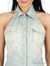 Детали: жилетка джинсовая, отложной воротник с острыми углами на втачной стойке, застежка на кнопки, два нагрудных накладных кармана с клапаном на кнопке, оригинальный крой, спинка открытая.