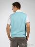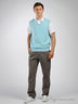 Трикотажный жилет с V-образным вырезом. Горловина, проймы и низ изделия посажены на трикотажные резинки. Плечи с кокеткой.