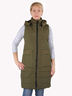 Жилет прямого кроя. Капюшон, воротник-стойка. Спереди застежка на молнию, по бокам карманы. Длина изделия: 95 см.