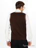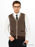 Детали: V-образный вырез горловины, без рукавов, застежка на пуговицах, два листочка с лицевой стороны имитируют кармашки, по низу изделия трикотажная резинка, ткань с лицевой стороны с узором - квадраты.