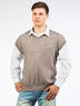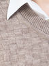 Жилет мужской однотонный свободного силуэта средней плотности. Полочка выполнена фактурной вязкой в виде мелких квадратов. Вырез горловины V-образный. Низ изделия и пройма оформлены трикотажной резинкой.