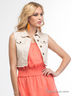 Укороченный жилет из однотонного бежевого денима. Проймы и низ оформлены бахромой с эффектом необработанного края. Металлические болты цвета состаренного золота.