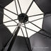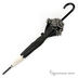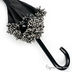 Шикарный зонт-трость черного цвета с отделкой рюшами из материала с узором "гусиная лапка" и бантиком. Пластиковая ручка, швы по спицам подчеркнуты кантом в тон рюшам.
